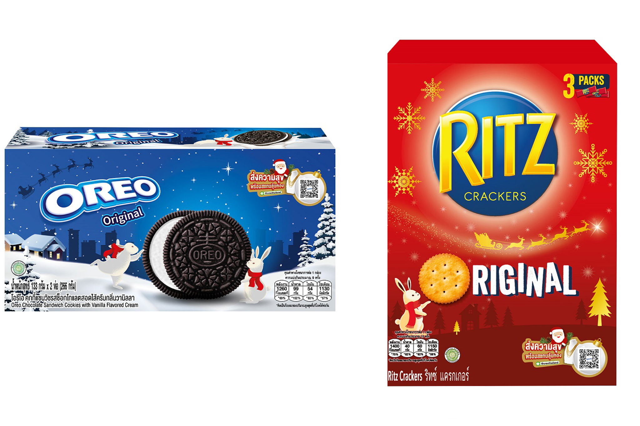 - โอรีโอ และ ริทซ์ แอสซอร์ตเต็ดซีเล็คชั่น บรรจุในกล่องสีน้ำเงิน-ทอง ดีไซน์สวยหรู ประกอบไปด้วย โอรีโอ ไส้ครีมวานิลลา, ช็อกโกแลต สตรอว์เบอร์รี่ และ ริทซ์แคร็กเกอร์ ไส้ครีมช็อกโกแลต ราคากล่องละ 159 บาท พร้อมข้อความอวยพรด้านใน สร้างความสุขและรอยยิ้มให้กับผู้รับทั้งผู้ใหญ่และทุกวัย