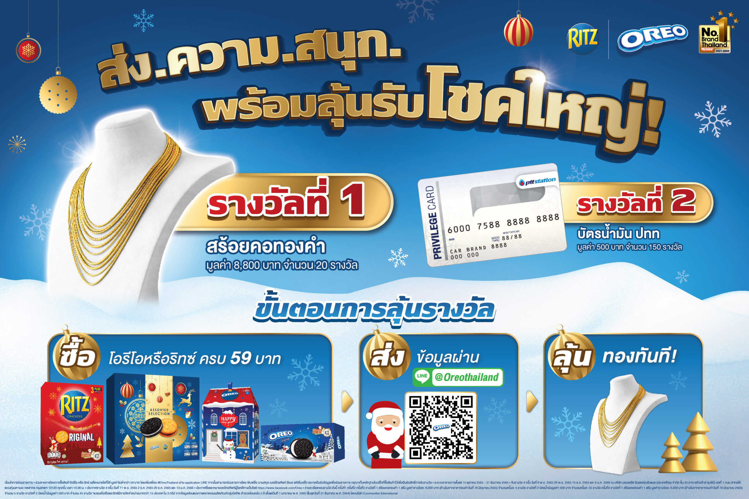 ไม่เพียงเท่านี้ โอรีโอ และ ริทซ์ยังร่วมเฉลิมฉลอง คืนความสุข ด้วยรายการคืนกำไร ลุ้นรับโชคใหญ่ รับปีใหม่ เพียงซื้อสินค้า โอรีโอ, ริทซ์เพียง 59 บาท นำใบเสร็จส่งเข้า Official Line @oreothailand ก็สามารถลุ้นโชคสร้อยคอทองคำ มูลค่ารางวัลละ 8,800 บาท จำนวน 20 รางวัล และบัตรเติมน้ำมัน ปตท. รางวัลละ 500 บาท อีก 150 รางวัล รวมมูลค่ากว่า 251,000 บาท ยิ่งส่งมากโอกาสรับความสุขยิ่งทวีคูณ กิจกรรมตั้งแต่วันที่ 15 ตุลาคม 2565 ถึงวันที่ 31 ธันวาคม 2565 ติดตามรายละเอียดเพิ่มเติมและติดตามกิจกรรมสนุกๆ ได้ทาง www.Oreothailand.com